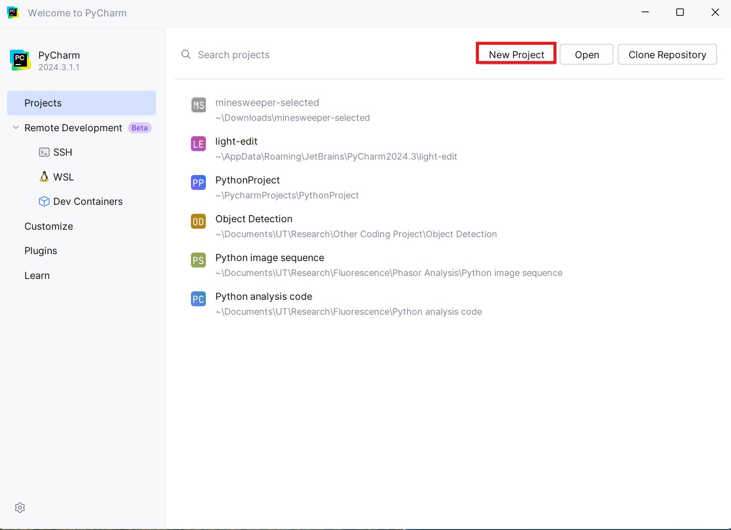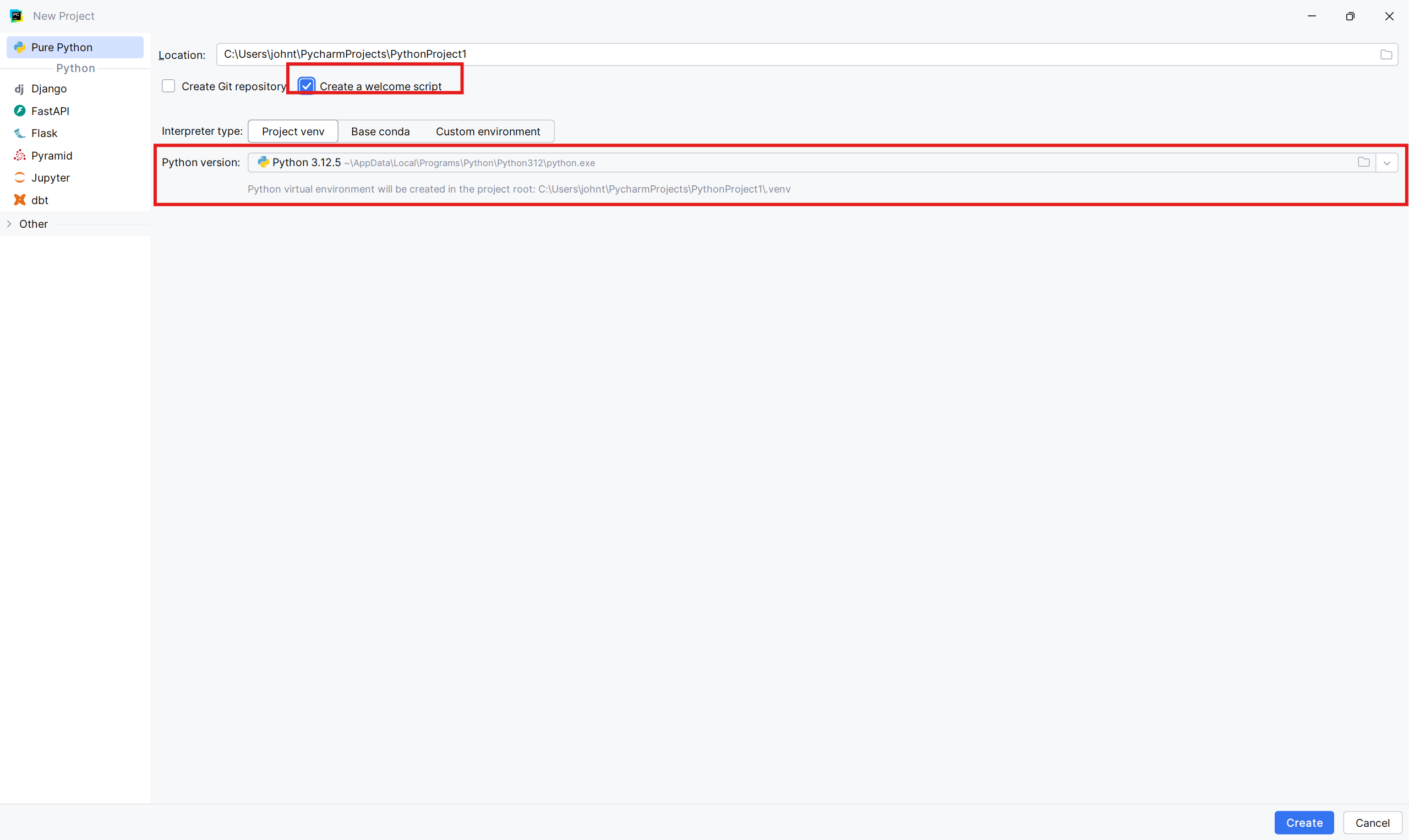 (1) Once the program is running, you need to create a new “Project”. Make sure to check if the interpreter is correctly selected and to check the box “Create a welcome script”.
