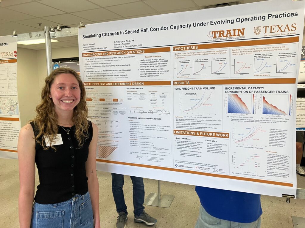 Thank you to TRAIN MS students Juliana Johnson and Matthew Friar for presenting their research posters at the UT Austin CAEE Grad Symposium! Juliana presented on her research simulating the performance and reliability of shared passenger-freight rail corridors on modern railway operating practices, while Matthew presented his work examining how well intercity passenger rail connects students to educational institutions and veterans to medical centers. Thanks for representing TRAIN so well!