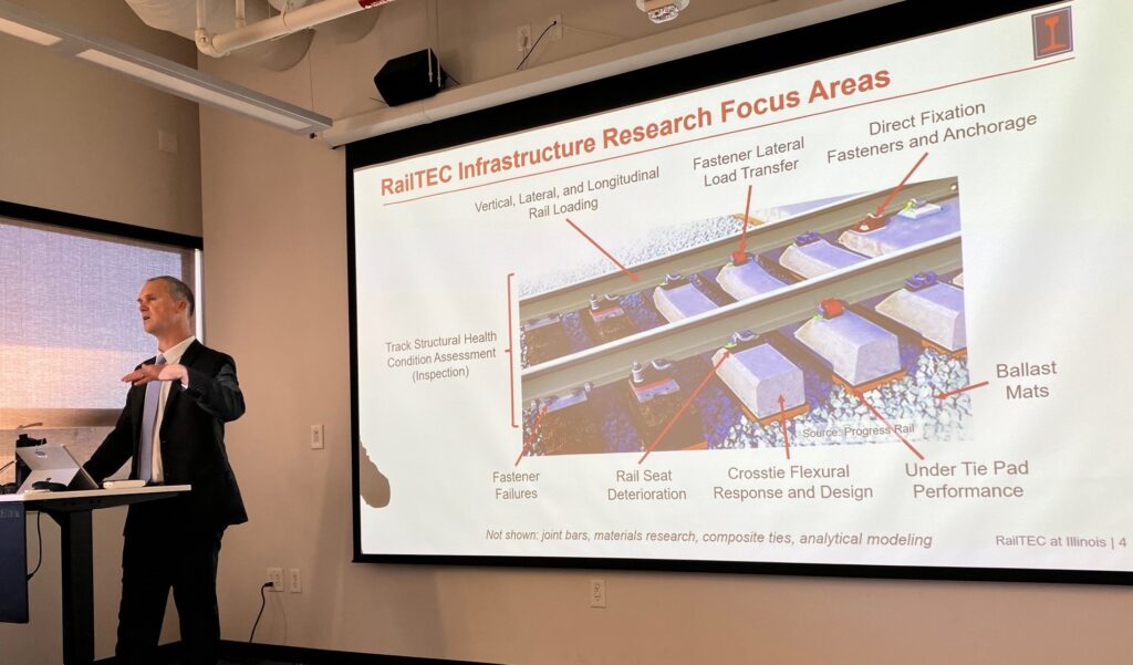 On November 13-14, 2024, TRAIN was excited to host a visit from Dr. Riley Edwards, Assistant Professor, University of Illinois Urbana-Champaign, who gave a seminar entitled “Leveraging Emerging Railway Track Health Data for Track Condition Assessment and Buckle Risk Hot Spot Detection”. It was great to see Riley and learn more about his ongoing research while discussing plans for collaboration through the new FRA-sponsored National University Rail Center of Excellence. Both UIUC RailTEC and the UT TRAIN Lab are members of this exciting new academic railway research, education and technology transfer consortium.