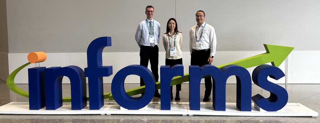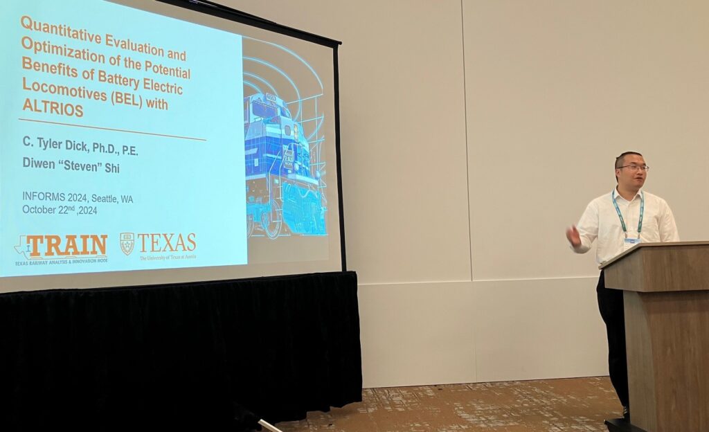 Later in October, Prof. Dick and TRAIN doctoral students Qianqian Tong and Steven Shi travelled to the INFORMS Annual Meeting in Seattle, along with several other members of the UT Transportation Group. Qianqian presented on her work to optimize the layout of inland truck-rail intermodal terminals. Steven presented on his work to evaluate the optimal deployment of battery electric locomotives across different battery sizes, route characteristics, train properties, and charging strategy. Prof. Dick also presented on TRAIN graduate Jiaxi Zhao’s research to model railway network dynamics with multi-yard simulation and mainline interaction.