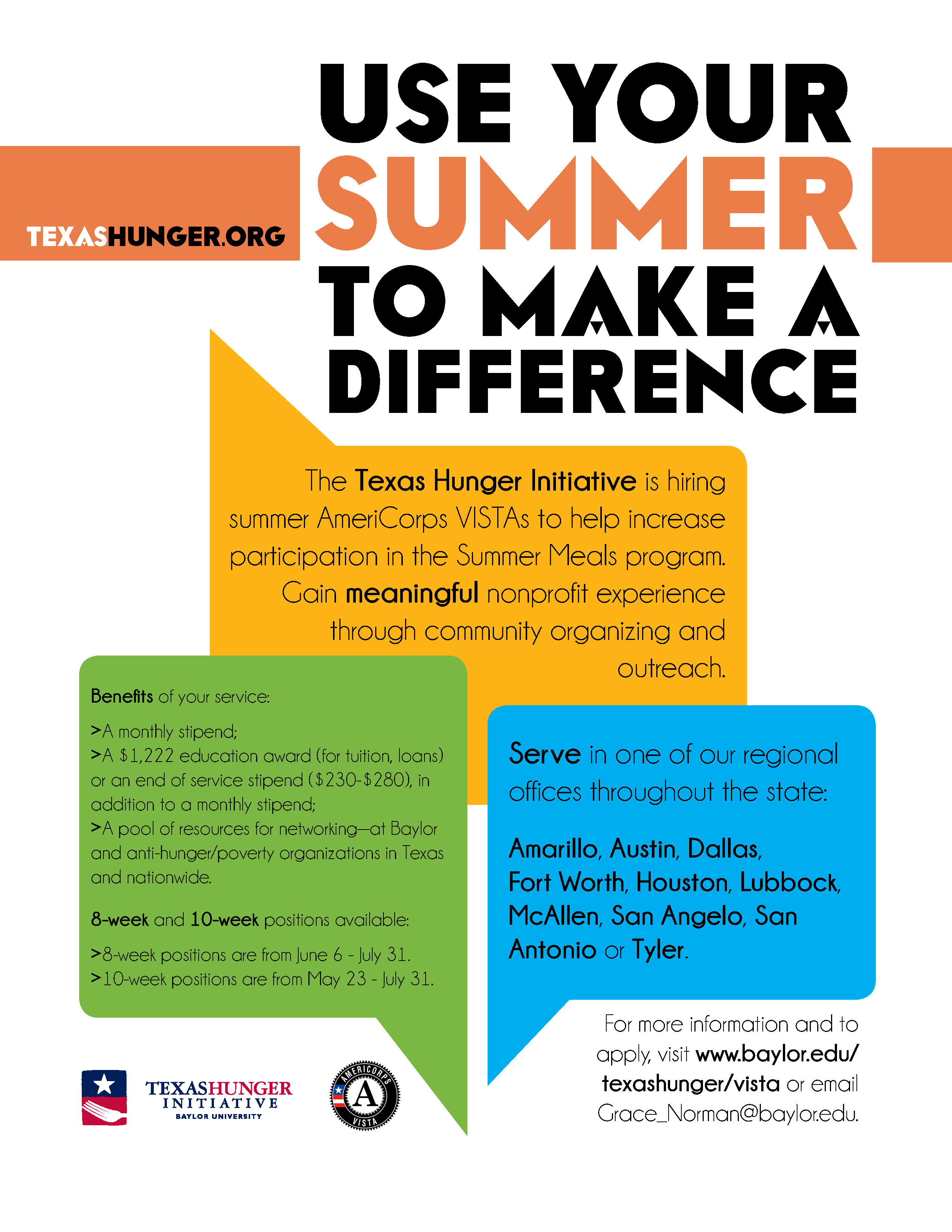 Baylor University’s Texas Hunger Initiative in partnership with Hunger Free America is seeking Summer Associate members to assist in the administration, implementation, access, and quality of the Summer Food Service Program (SFSP).