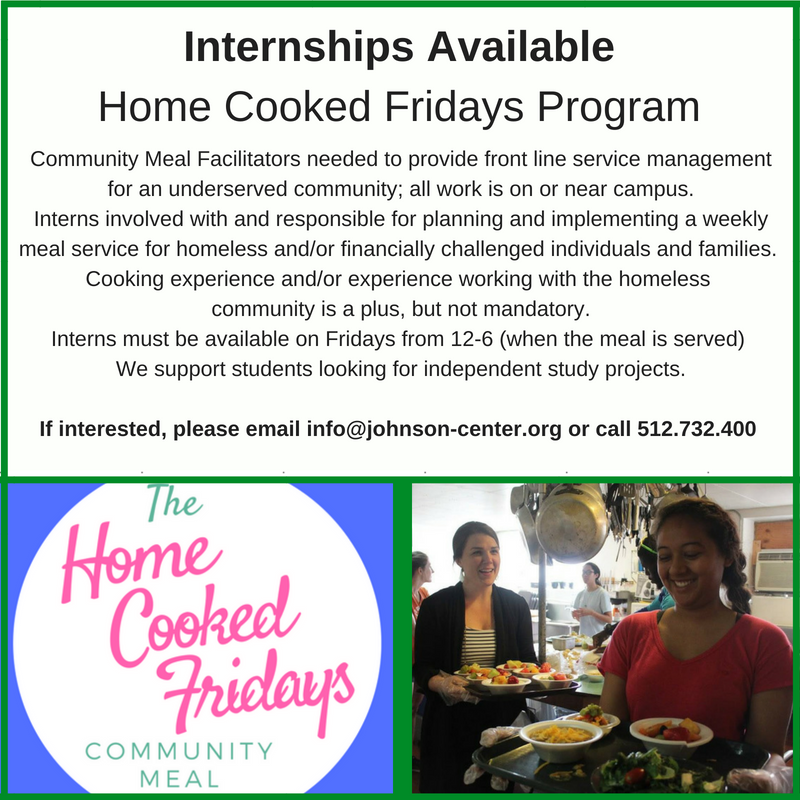 Fall Interns Needed to participate in the Home Cooked Fridays program. Community Meal Facilitators will provide front line service management to an underserved community; all work is on or near campus.