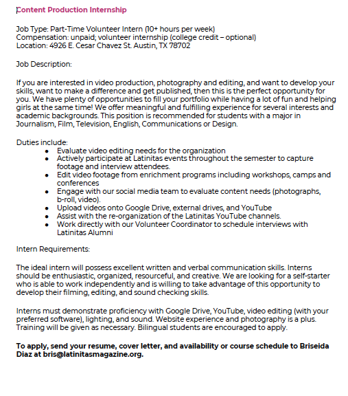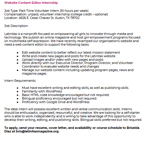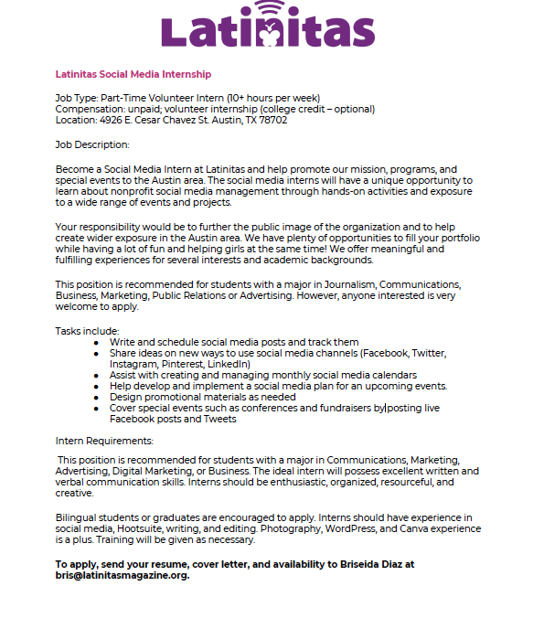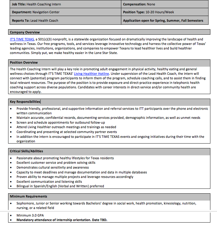 The Central Texas Food Bank Community Engagement Department is looking to appoint a motivated, organized, detail-oriented intern with an interest in project management and a desire to work in a fast paced agency environment. The candidate should have the ability to work under pressure and meet deadlines. A sense of humor and humility are essential. Additionally, the ideal candidate will:
