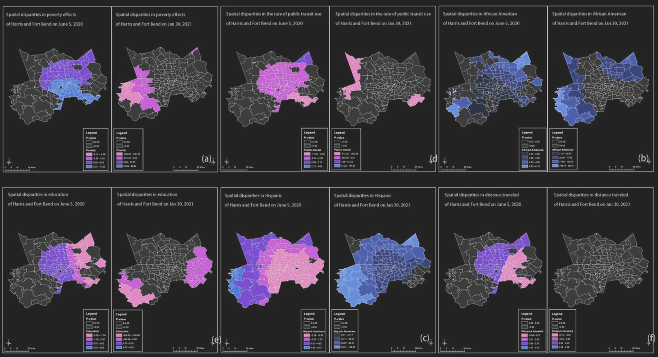 January 22, 2024, Filed Under: ProjectsExploring temporal varying demographic and economic disparities in COVID-19 infections in four U.S. areas: based on OLS, GWR, and random forest models Abstract: Although studies have previously investigated the spatial factors of COVID-19, most of them were conducted at a low resolution and chose to limit their study areas to high-density urbanized regions. Hence, this study aims to investigate the economic-demographic disparities in COVID-19 infections and their spatial-temporal patterns in areas with different population densities in the United States. In particular, we examined the relationships between demographic and economic factors and COVID-19 density using ordinary least squares, geographically weighted regression analyses, and random forest based on zip code-level data of four regions in the United States. Our results indicated that the demographic and economic disparities are significant. Moreover, several areas with disadvantaged groups were found to be at high risk of COVID19 infection, and their infection risk changed at different pandemic periods. The findings of this study can contribute to the planning of public health services, such as the adoption of smarter and comprehensive policies for allocating economic recovery resources and vaccines during a public health crisis. For more information, please visit https://www.ncbi.nlm.nih.gov/pmc/articles/PMC8642183/ Share this: