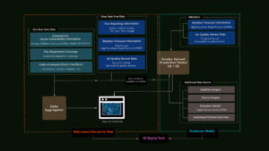 January 28, 2024, Filed Under: ProjectsFire and Smoke Digital Twin – A computational framework for modeling fire incident outcomes ABSTRACT Fires and burning are the chief causes of particulate matter (PM2.5), a key measurement of air quality in communities and cities worldwide. This work develops a live fire tracking platform to show active reported fires from over twenty cities in the U.S., as well as predict their smoke paths and impacts on the air quality of regions within their range. Specifically, our close to real-time tracking and predictions culminates in a digital twin to protect public health and inform the public of fire and air quality risk. This tool tracks fire incidents in real-time, utilizes the 3D building footprints of Austin to simulate smoke outputs, and predicts fire incident smoke falloffs within the complex city environment. Results from this study include a complete fire and smoke digital twin model for Austin. We work in cooperation with the City of Austin Fire Department to ensure the accuracy of our forecast and also show that air quality sensor density within our cities cannot validate urban fire presence. We additionally release code and methodology to replicate these results for any city in the world. This work paves the path for similar digital twin models to be developed and deployed to better protect the health and safety of citizens. For more information, please visit https://arxiv.org/pdf/2305.18313.pdf#:~:text=FireCOM%20is%20a%20digital%20twin,(3)%20air%20quality%20data. Share this: