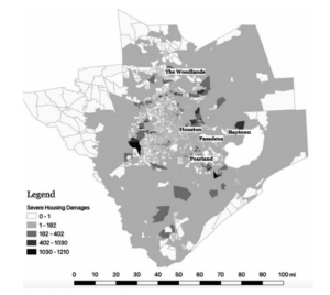 April 7, 2024, Filed Under: ProjectsHurricane Harvey: equal opportunity storm or disparate disaster ABSTRACT: Following Hurricane Harvey, media outlets labeled it as an “equal opportunity” disaster, challenging existing research on social vulnerability which indicates marginalized groups face disproportionate risks and impacts from disasters. To assess the accuracy of this claim, we utilized regression techniques to analyze the relationship between social vulnerability indicators and FEMA-approved housing damages across five Houston-area cities. Results indicate that Hurricane Harvey had a disproportionate impact on housing damages for Black, Latinx, and mobile home residents, highlighting the need for informed policy decisions to enhance flood resilience and recovery efforts in the region. The cover image is sourced from Pexels and is free of copyright issues. For more information, please visit: https://www.tandfonline.com/doi/full/10.1080/13549839.2021.1886063# Share this: