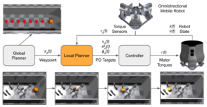 April 7, 2024, Filed Under: ProjectsWhat Goes Bump in the Night: Learning Tactile Control for Vision-Occluded Crowd Navigation Abstract: Expanding the deployment of robots in social environments necessitates safe navigation in contact-prone settings. While collision-free navigation is well-studied, incorporating safe contacts remains underexplored. Traditional approaches mandate robots to freeze upon detecting imminent collisions, risking harm and impeding movement in dense crowds. To address this, we propose a learning-based motion planner and control scheme for omnidirectional mobile robots to navigate ultra-dense social environments using safe contacts. Our approach considers minimizing discomfort to humans, formulated as a multi-task reinforcement learning problem. Evaluated over 160 simulations with varying crowd densities, our navigation scheme achieves a 100% safety factor in crowds up to 1.0 people per square meter and 90% in denser crowds, surpassing previous reported capabilities. The cover image is sourced from Pexels and is free of copyright issues. For more information, please visit: https://openreview.net/forum?id=v5QSAGjJmS Share this: