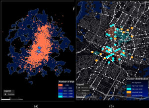 April 28, 2024, Filed Under: ProjectsUnderstanding the Shared E-scooter Travels in Austin, TX Abstract: This paper examines the travel patterns of 1.7 million shared E-scooter trips in Austin, TX, spanning from April 2018 to February 2019. With over 6,000 active E-scooters monthly, these trips covered approximately 117,000 miles. During this period, the average trip distance was 0.77 miles, lasting 7.55 minutes. Two primary E-scooter hotspots were identified: Downtown Austin and the University of Texas campus. Spatial analysis revealed more trips originating from Downtown than being completed, with the opposite trend observed for the UT campus. The study also explores the relationship between E-scooter trips and surrounding environments, finding correlations with higher population density, residents with higher education levels, proximity to the city center, presence of transit stations, better street connectivity, and compact land use. Unexpectedly, the proportion of young residents within neighborhoods showed a negative correlation with E-scooter usage. The cover image is sourced from Pexels and is free of copyright issues. For more information, please visit: https://www.mdpi.com/2220-9964/9/2/135 Share this: