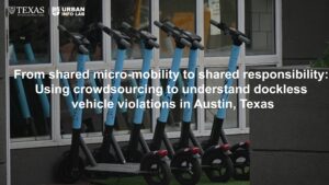 April 20, 2024, Filed Under: ProjectsFrom shared micro-mobility to shared responsibility: Using crowdsourcing to understand dockless vehicle violations in Austin, Texas Abstract: In recent years, dockless small vehicles have surged in progressive U.S. cities as a car-free travel alternative for short distances. However, little is known about the social impact of this influx on public space. This study examined 4,100 parking violation reports in Austin, Texas, sourced from the Austin 311… read more