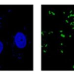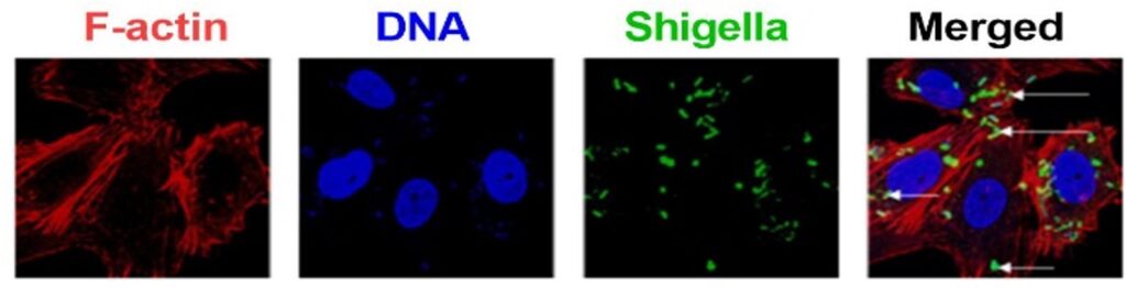These microscopy images are of glioblastoma (GBM) cells incubated with GBM-infecting shigella. F-actin indicates the cell boundary to demonstrate that the bacteria (rendered green) are inside the cell. We envision these bacteria as a drug delivery platform to eradicate any GBM tumor missed during surgery.