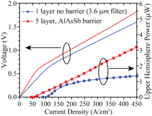 The low cost and high efficiency of visible and near-IR light emitting diodes have played a vital role in a number of applications, including solid state lighting and consumer electronics, allowing for efficient incoherent light emission from semiconductor materials. However, similar efficiencies are difficult to achieve in the longer wavelength mid-IR, where LEDs might have potential applications in low-cost sensing platforms and “thermal television” screens for security and defense applications. In this program we are investigating the utility of semiconductor quantum dots, nanometer scale structures embedded in a host material, capable of emitting light at mid-IR wavelengths. We are looking to develop new device architectures and growth parameters in order to increase emission efficiency and temperature performance for LEDs operating in the 4-6 um range.