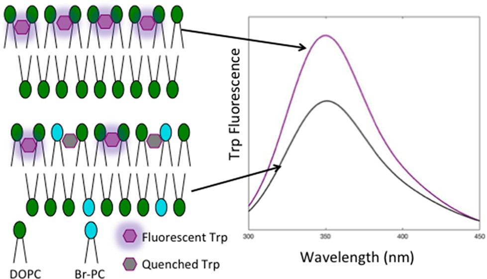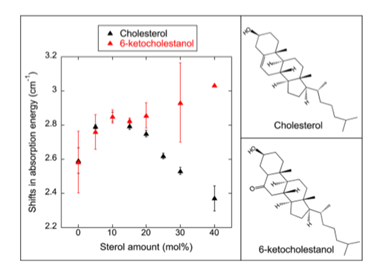 Lipid bilayer vesicles Peptide penetration in lipid bilayer vesicles By exploring the complex network of electrostatic forces in a dynamic and heterogeneous biological membrane, we aim to better understand the underlying molecular mechanism of membrane structure, dynamics, and function, including vital functions such as unassisted transport of small molecules and peptides across the bilayer. Using a variety of characterization methods including fluorescence spectroscopy, UV-visible spectroscopy, and NMR, we are investigating membranes at a molecular level to investigate the mechanism of membrane permeation. Sterols in lipid bilayer vesicles bla bla bla bla bla Lipid bilayer membranes control critical elements of biological function through structural and electrostatic mechanisms. The structure of the lipid bilayer depends on numerous factors such as the chemical identity of lipids, the intercalation of small molecules such as sterols into the bilayer, and phase separation of lipid and protein-lipid domains. This creates a complex electrostatic environment that has important consequences for interactions between the membrane and proteins associated with it. In our laboratory, we have applied vibrational Stark effect (VSE) spectroscopy, coupled with molecular dynamics simulations from collaborators, to directly measure the magnitude and direction of an electric field within the membrane interior. For example, we have successfully incorporated cholesterol and 6-ketocholestanol (6-kc) into a phospholipid bilayer and demonstrated that the presence of an extra ketone group on 6-kc causes distinct membrane fluidity and electrostatic profiles within the membrane.