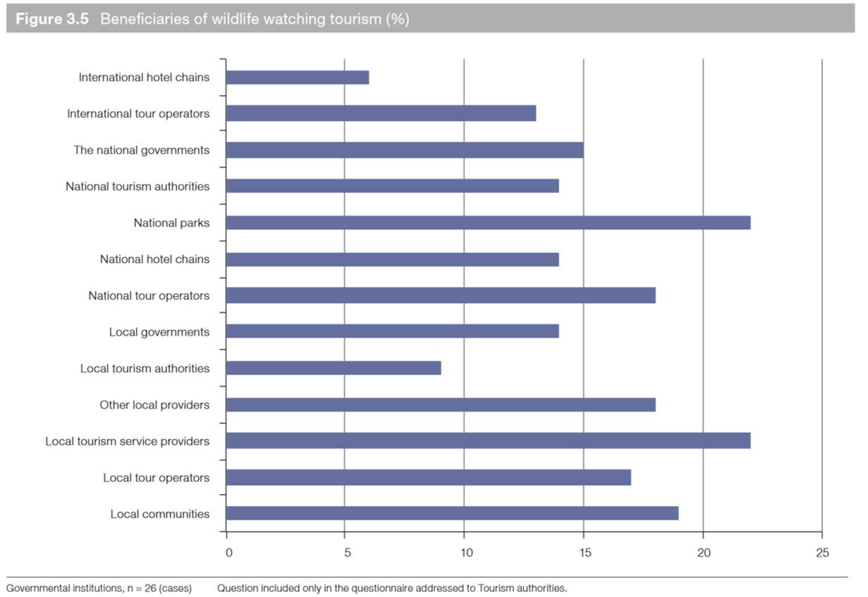 UNWTO concludes that wildlife watching tourism benefits a wide range of stakeholders, including national parks, local tourism providers, and local communities. As revealed by the two graphics below, the recipients of wildlife watching tourism are varied and numerous.
