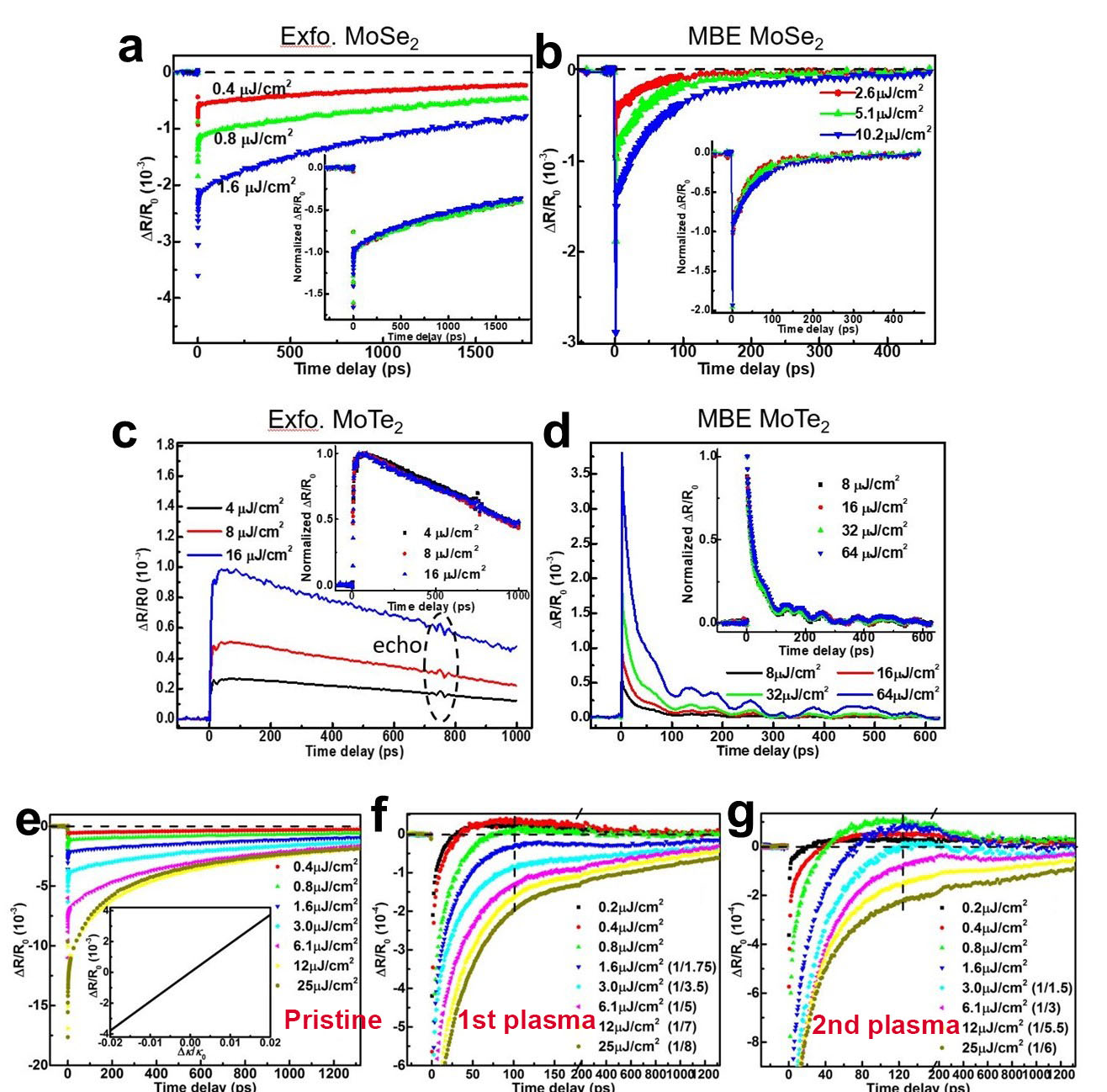 Fig a&b c&d Differential reflection signals of exfoliated TMDs (less defects) and MBE-grow TMDs (more defects) showing faster carrier recombination rate due to grain boundary/edge defects e&f&g Differential reflection signals showing the plasma-created O2 impurity’s impact on carrier dynamics by generating mid-gap defects