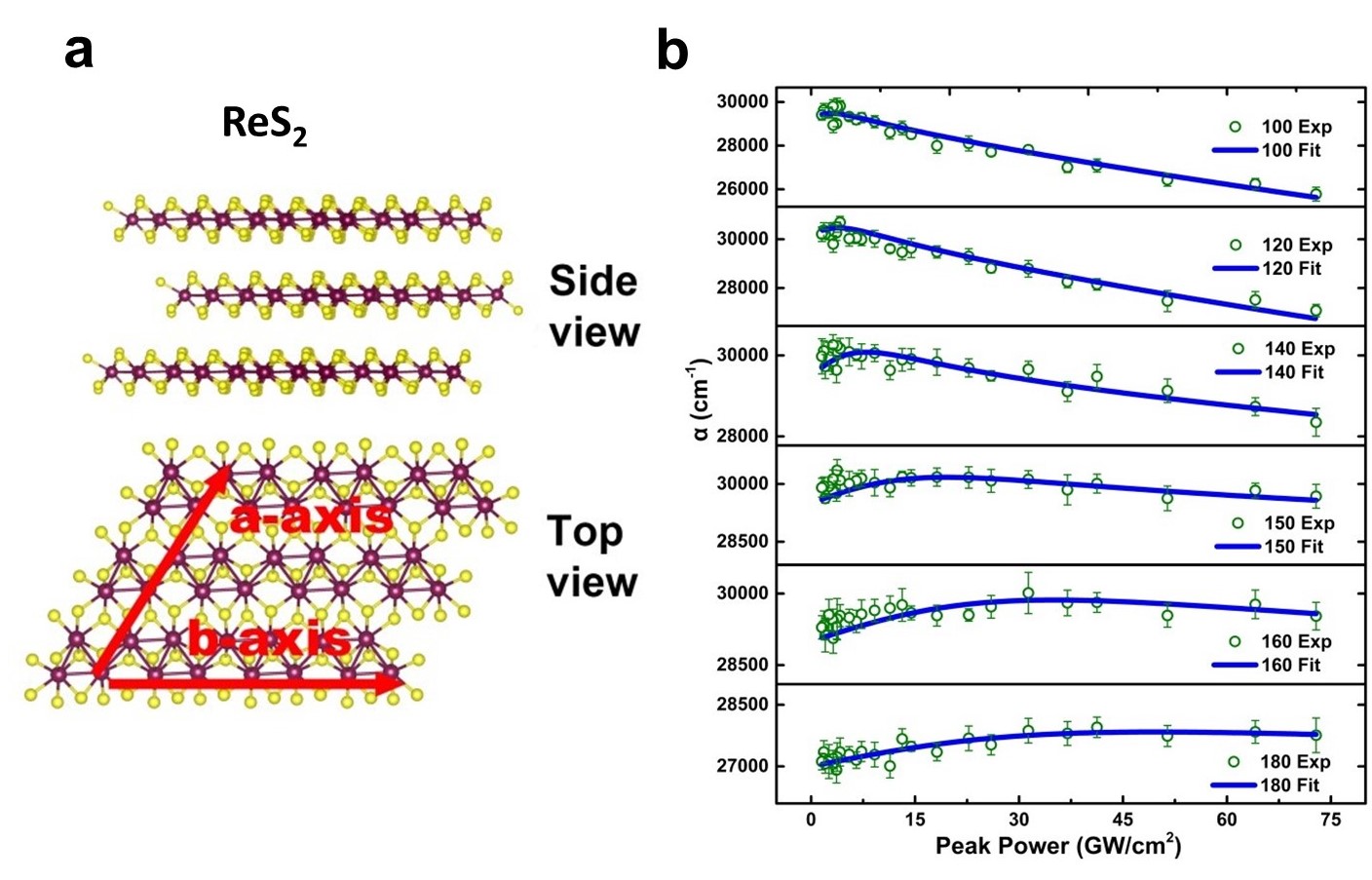 Fig a. Schematics of ReS2 crystal structure b. Absorption coefficients at increasing peak power at different polarization conditions (different angle between laser polarization and b-axis of ReS2)