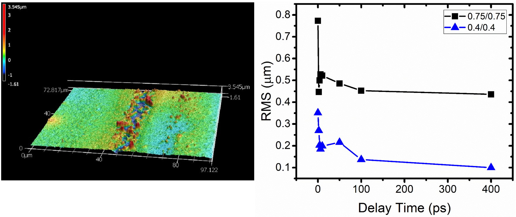 We evaluated the surface roughness of our sintered spots using an optical profilometer, as illustrated in Fig. 3. We plotted the root mean square (RMS) of surface roughness as a function of the delay time between the double pulses, and observed a significant reduction in roughness with increasing delay time. Specifically, we found that the surface roughness decreased rapidly from 0 to 10 ps, which is slightly longer than the electron-phonon coupling time. At a delay time of 10 ps, we observed a 32% decrease in RMS for the 0.75/0.75 power setup, and a 43% decrease for the 0.4/0.4 power setup. These results demonstrate the effectiveness of our double-pulse sintering method in reducing surface roughness and achieving high-quality 3D printed parts.