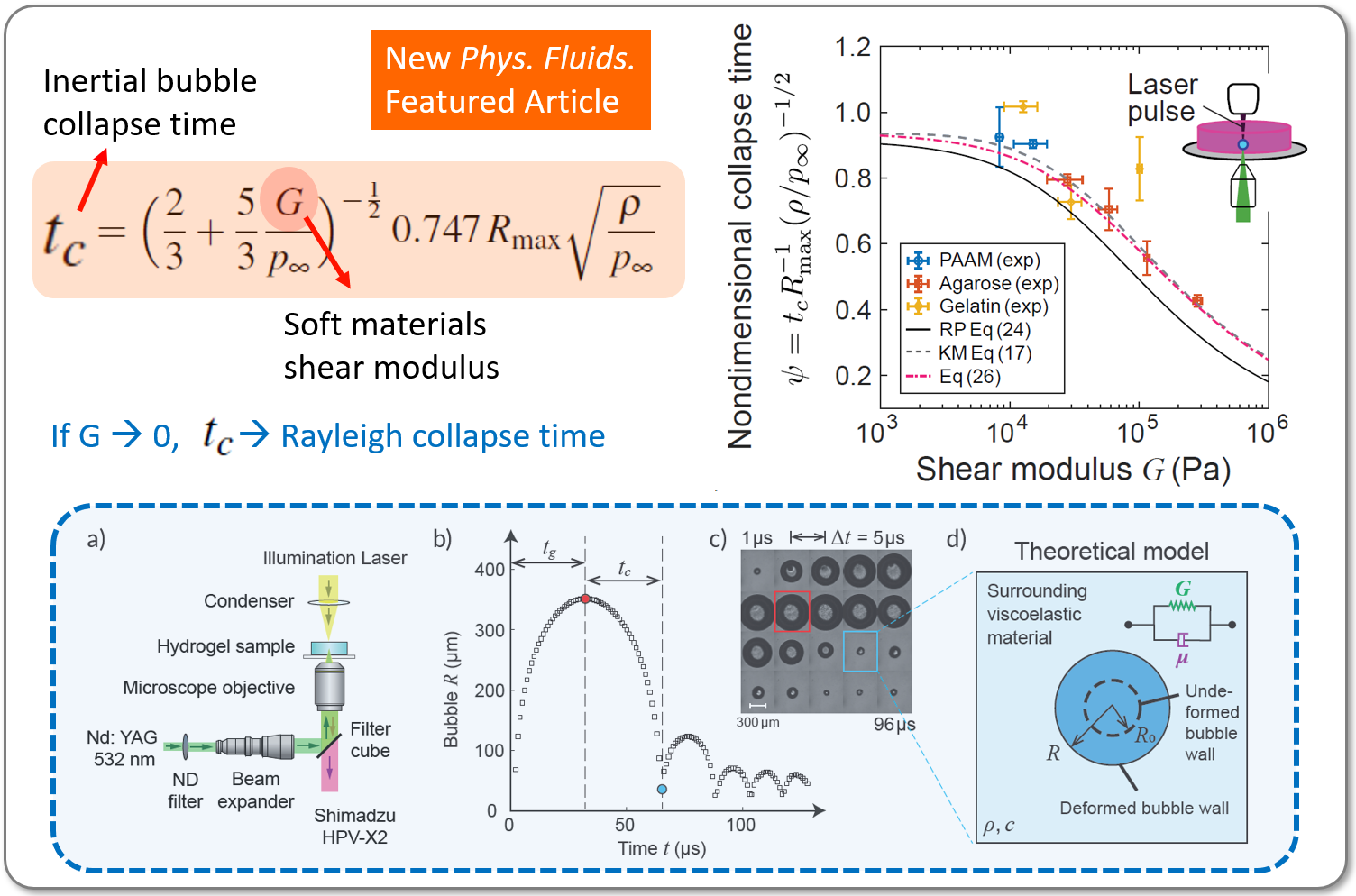 By harnessing sound, the viscoelastic properties of soft materials at high strain rates (> 1,000 1/s) can be decoded based on a modified Rayleigh cavitation bubble collapse time. Congratulations on our newly accepted Physics of Fluids research paper being selected as a Featured Article: “Estimating viscoelastic, soft material properties using a modified Rayleigh cavitation bubble collapse time”.