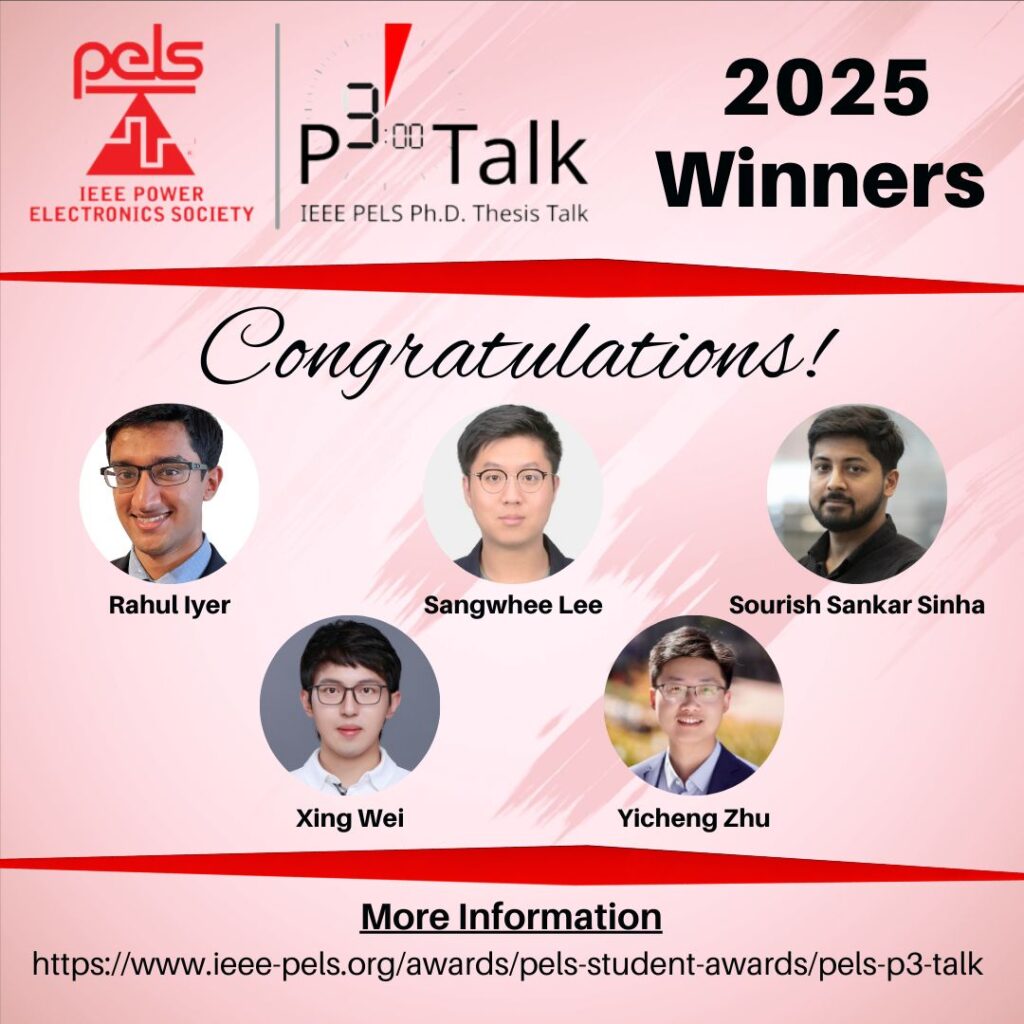 The IEEE PELS Ph.D. Thesis Talk (P3 Talk) competition showcases Ph.D. projects to the power electronics community. This annual award recognizes outstanding graduates who have successfully defended their dissertations and submitted an additional video presentation to the IEEE Power Electronics Society (PELS). Each year, up to five presenters are selected. Participants are judged based on the achieved outcomes of their work in power electronics, the rigor of their design methodology, net contribution to the progress of the field, and quality of presentation.